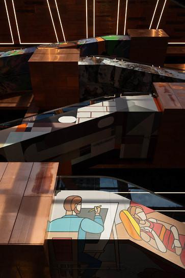 «Мы находимся в районе ЗИЛ, который превратился в новейшей истории благодаря Андрею Молчанову в "Зиларт". Идея этого здания — портал или лоджия классического города. Впечатляющее пространство, в которое ты входишь, и все еще находишься в городе. И то, что материал снаружи и внутри здания один и тот же — это очень важно, чтобы подчеркнуть: перед нами часть колоссального общественного пространства города. Работы художников на эскалаторах и на лифтах это тоже подчеркивают,— рассказывает Сергей Чобан.— Как помните, во Флоренции подходишь к галерее Уффици с площади и попадаешь в лоджию. Ты еще не внутри, но уже не снаружи. Сюда будут, надеюсь, приезжать гости не только из Москвы, из России, и будут входить вот в эту большую лоджию, оказываться и еще на пространстве бульвара, и уже в музее. Будут отсюда смотреть на отдельные галереи. Проходить в общественное пространство внутри, конференц-залы, библиотеку, магазин».