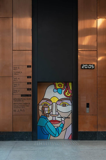Внутри выясняется, что затемненное снаружи стекло фасадов на самом деле имеет отличную светопроницаемость. Лобби высотой во все пять этажей музея — автор проекта здания архитектор Сергей Чобан предпочитает говорить, что делал все же лоджию по примеру итальянских городских построек,— залито дневным светом. Вверх на этажи уводят четкие линии эскалаторов. Их боковые и нижние поверхности, видимые от входа, уже заняты работами стрит-арт-художников.
