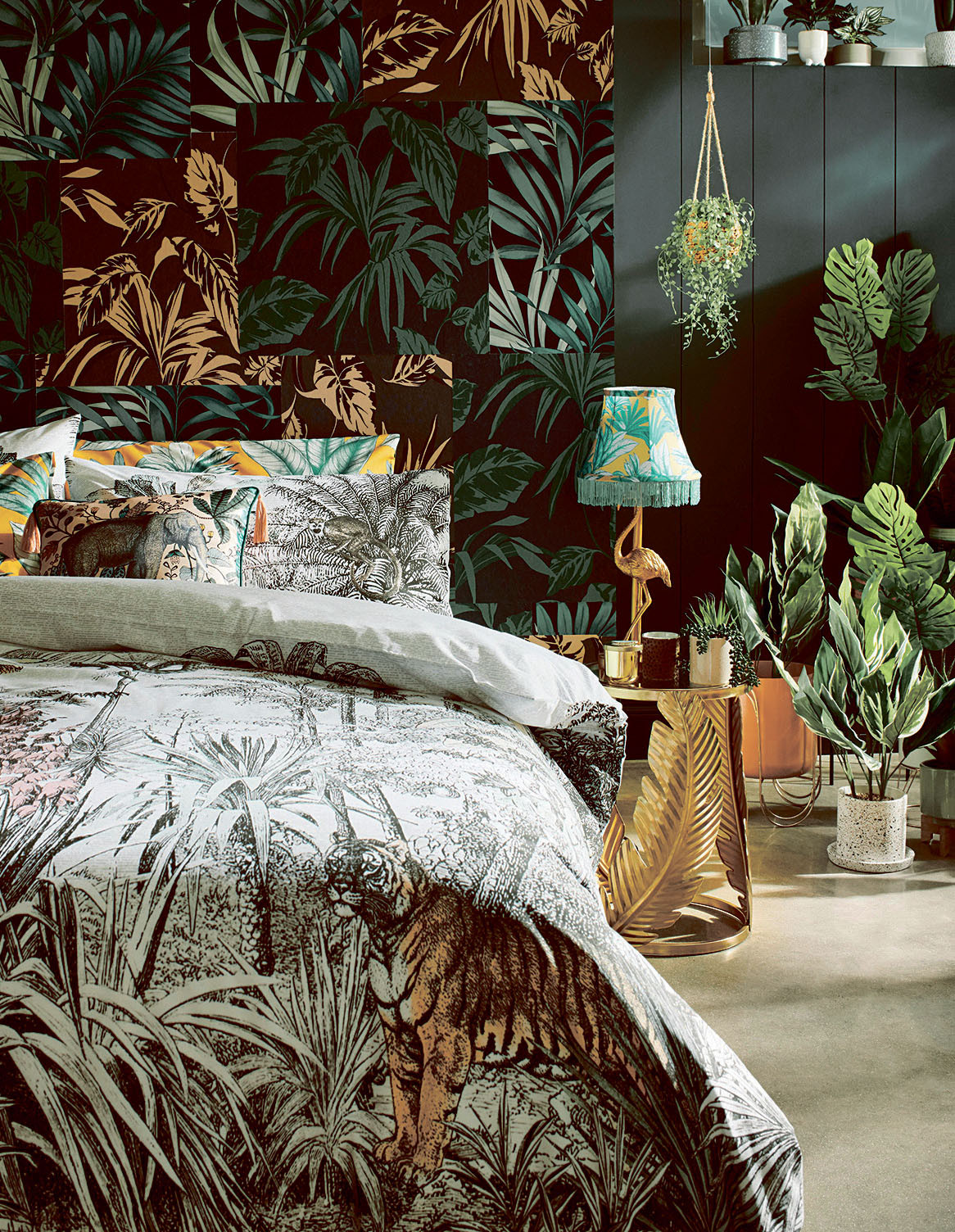 Тема джунглей не теряет популярности, причем в этом году в моде еще более яркие и насыщенные цвета, которые используются даже при оформлении спальни. Как преобразить пространство без чрезмерных затрат? Подберите обои (поклеить их можно только на одну стену – акцентную), дополните эффект постельным бельем и тропическими растениями в горшках.