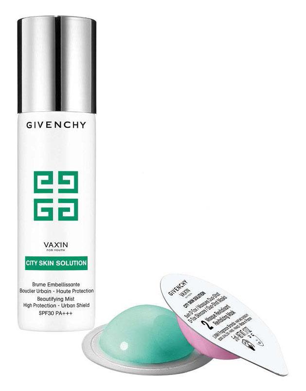 Пополнение в линии VAX’IN for Youth City Skin Solution, Givenchy: двойная маска (зеленая – выводит токсины, розовая – наполняет кожу сиянием) и спрей для лица (нейтрализует загрязнения и защищает от солнца).