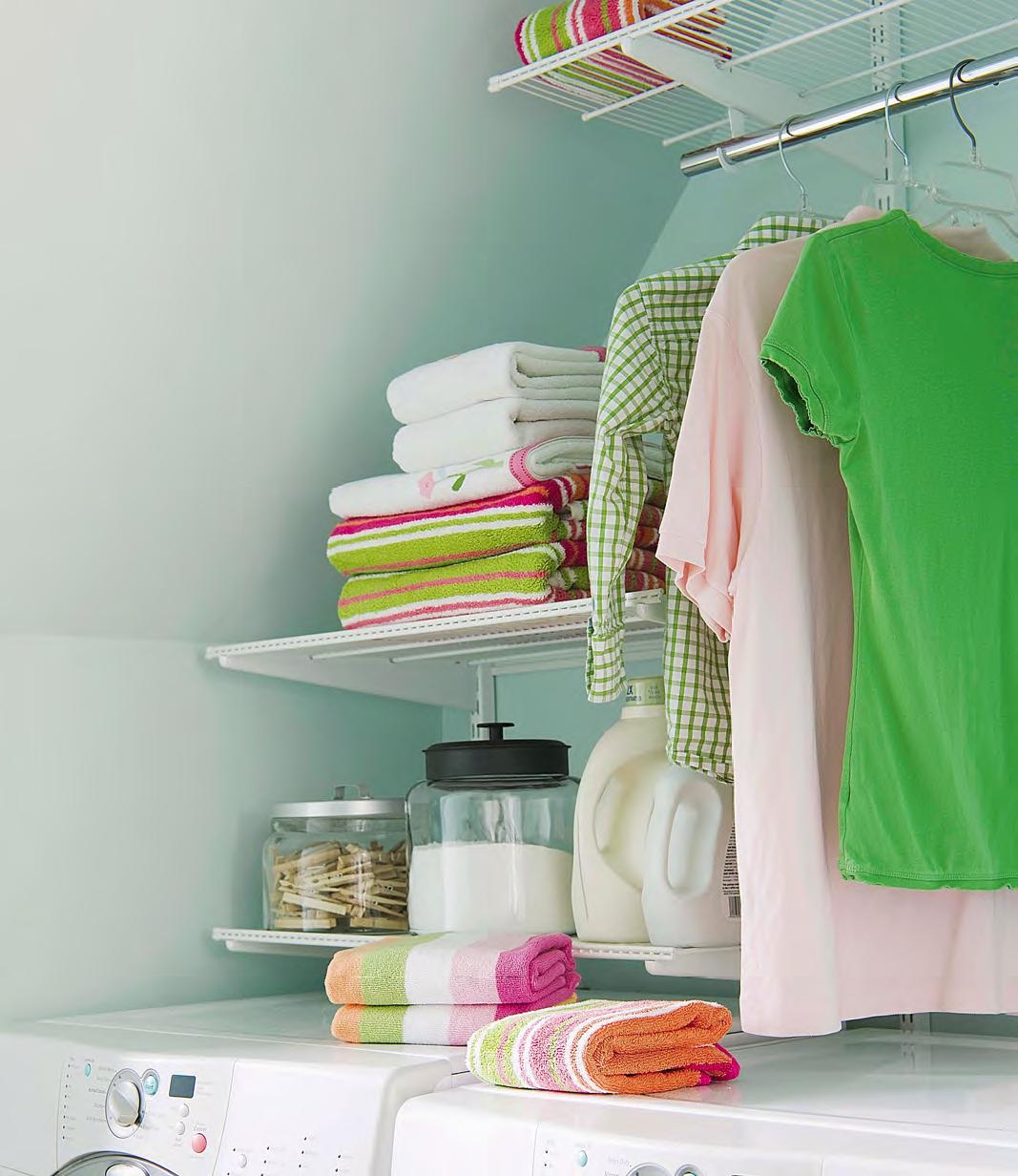 Если место позволяет, для удобства можно установить над машинкой столешницу из обычной обработанной доски, а сверху добавить несколько полок для бытовой химии, чистого белья, прищепок и т.д. Храните средства для стирки в одном месте, собрав их в отдельный контейнер или корзину. Лучше, если такой контейнер с ручками, чтобы средства было удобнее переставлять и переносить. Если, к примеру, понадобится пятновыводитель, вам не придется вспоминать и разыскивать его по шкафчикам.