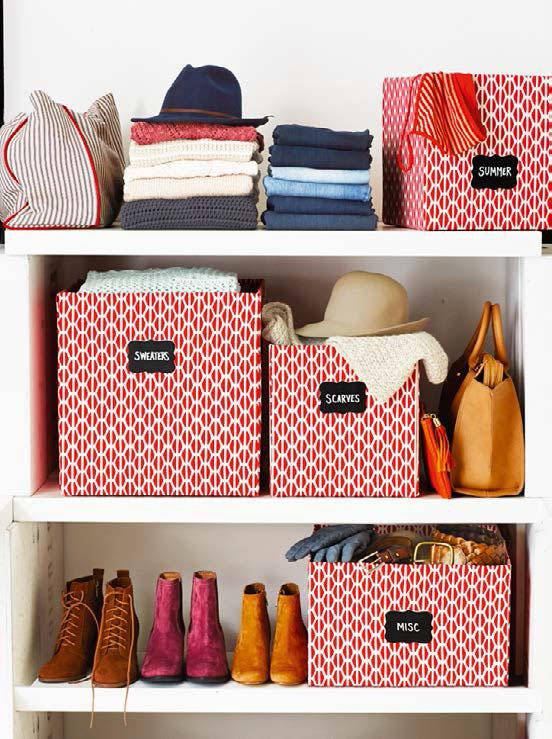 Точно по мерке. Необязательно покупать органайзеры для вечно валяющихся как попало ремней, шарфов и сумок – сделайте контейнеры для хранения из картонных коробок сами. Отрежьте верхние клапаны, обрежьте коробку до нужной высоты. Декорируйте контейнеры оберточной бумагой и приклейте спереди этикетку.