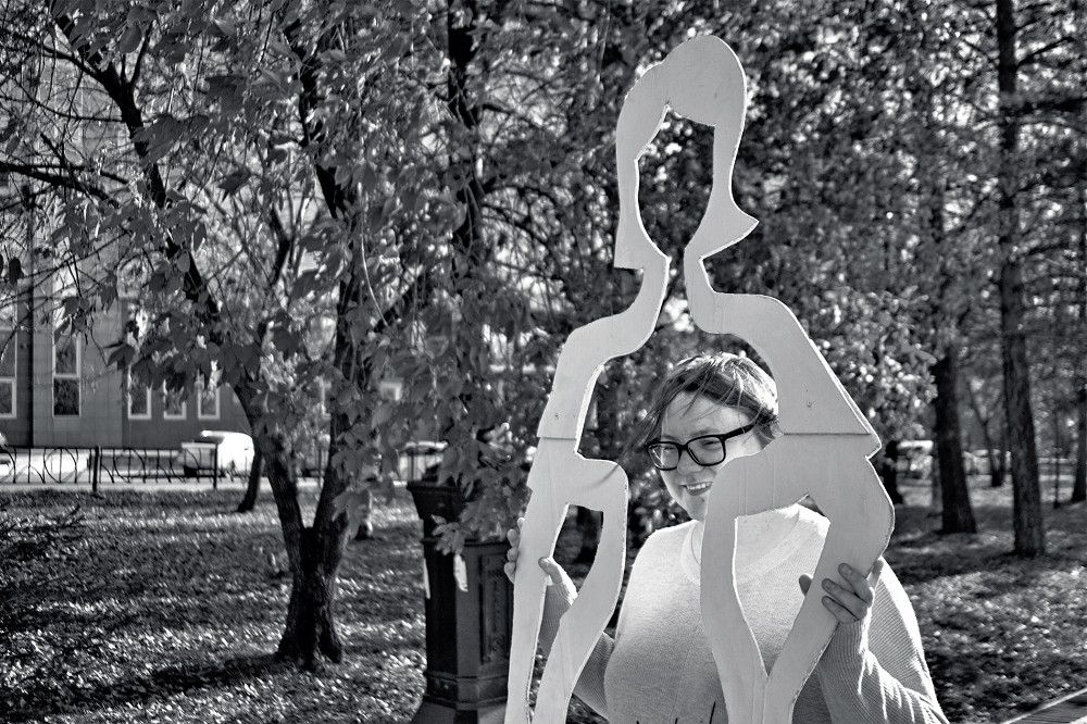 И тут я вспомнила, как на городском фестивале «Кварталы» выпиливала фигуры из фанеры. Они были лёгкими, яркими и имели большой успех. То, что нужно! Так родилась концепция: фанерный контур женщины, а внутри дыра, потому что памятника-то нет. И памяти нет, она стирается. Это страшный процесс: я, например, ходила на обзорную экскурсию в наш краевой музей, и за полтора часа там прозвучало только одно женское имя — экскурсовода.