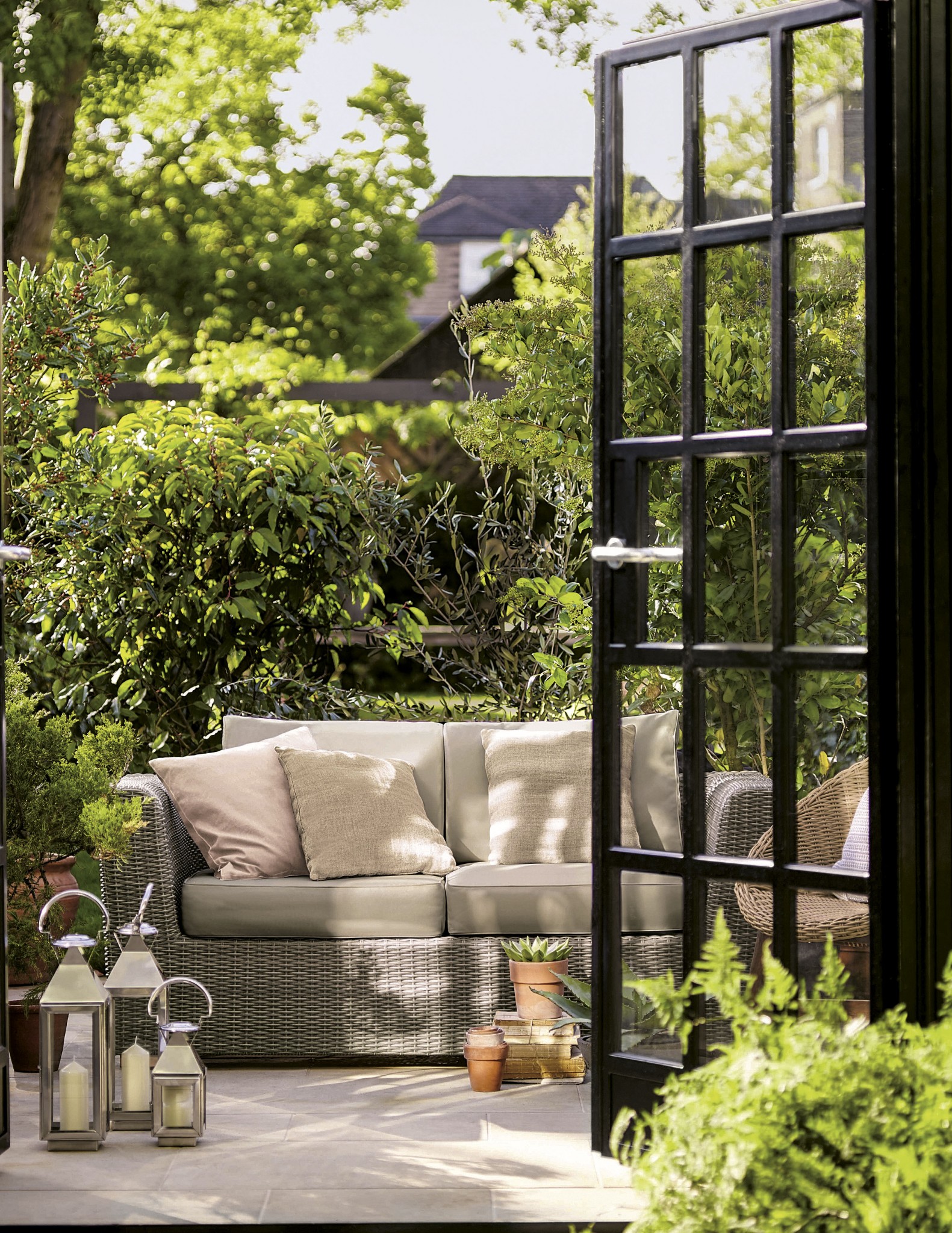 Диваны и кресла с мягкими съемными сиденьями размещайте ближе к дому, чтобы перемена погоды не застала врасплох.