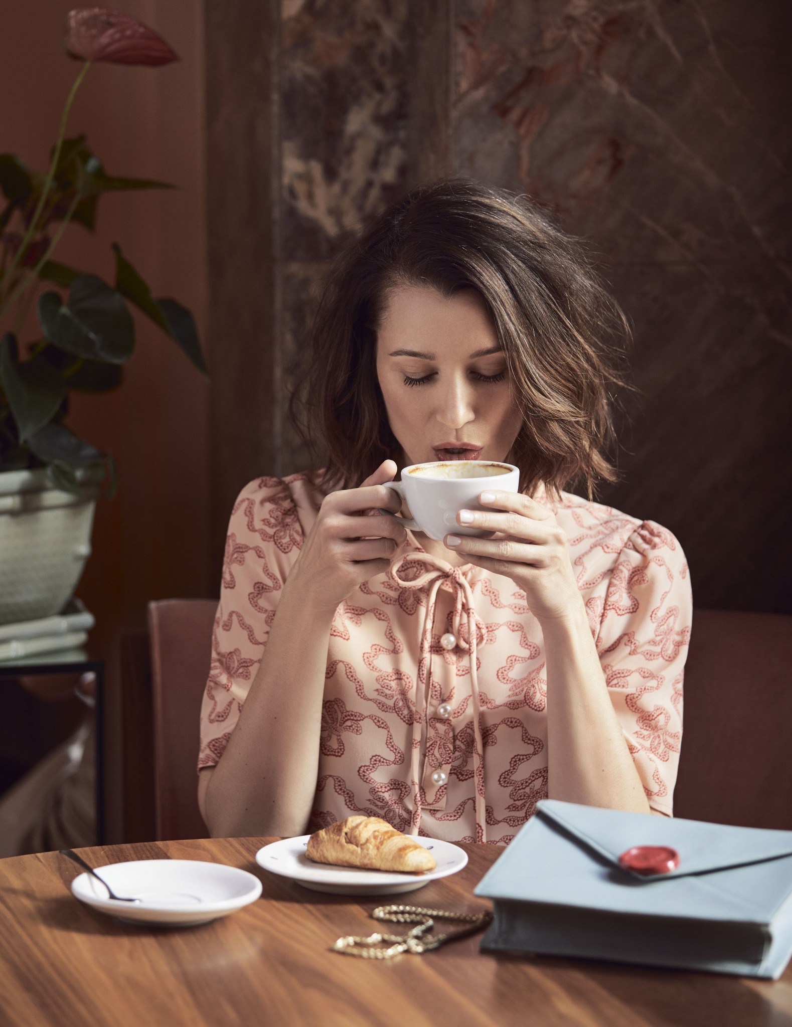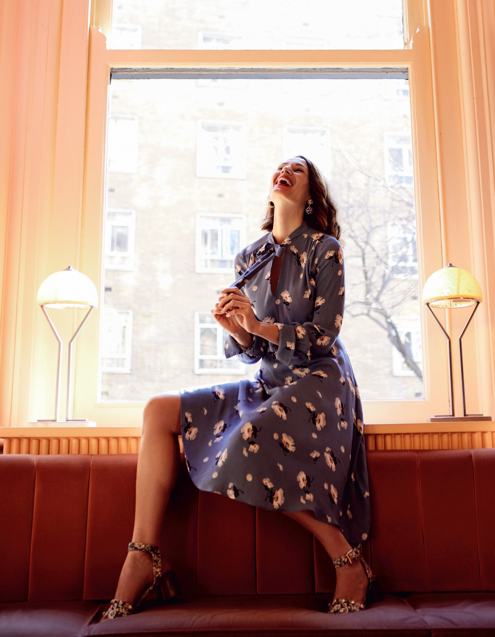 Игривый принт, кокетливый бантик, слегка растрепанные волосы – да, мы знаем, как сводить с ума. Дополните образ сумкой-конвертом на длинной цепочке.