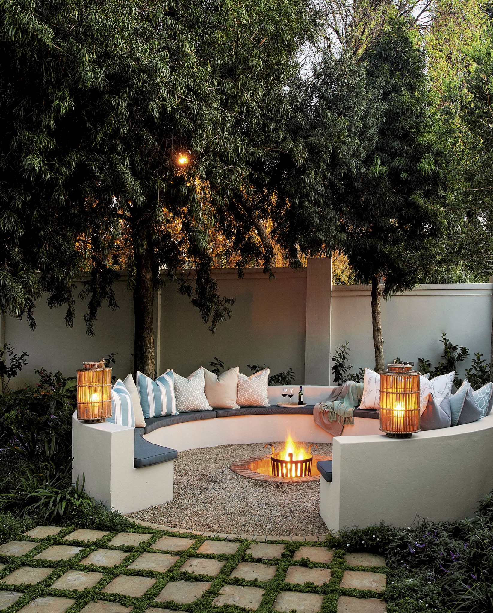 Круговой садовый «диван» из каменной отштукатуренной кладки с мягкими съемными сиденьями обрамляет загрунтованную площадку. В центре – кострище в углублении.
