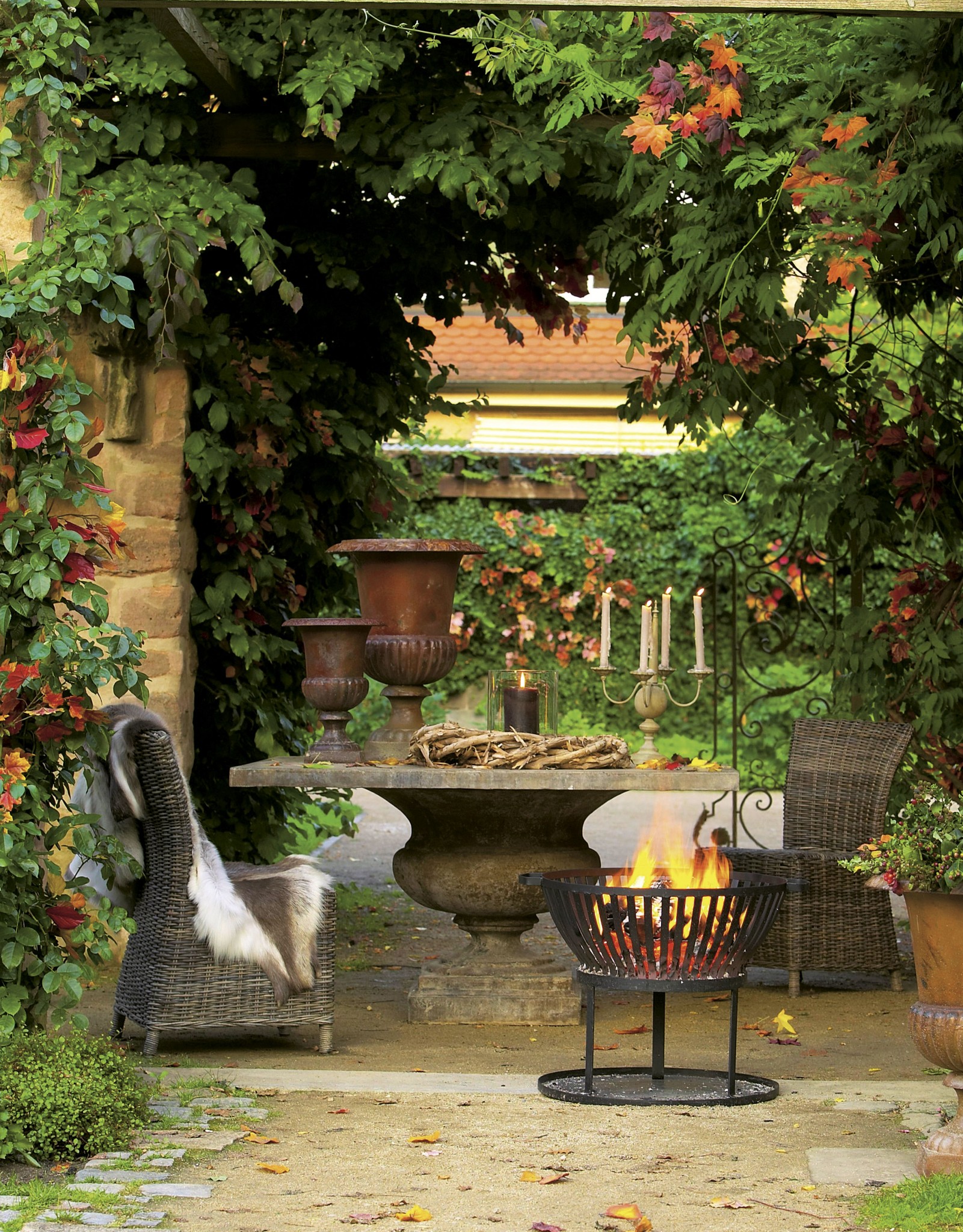 Уголок сада в античном стиле, украшен большими вазонами, столом из камня и арками. Место для огня – переносная кованая чаша.