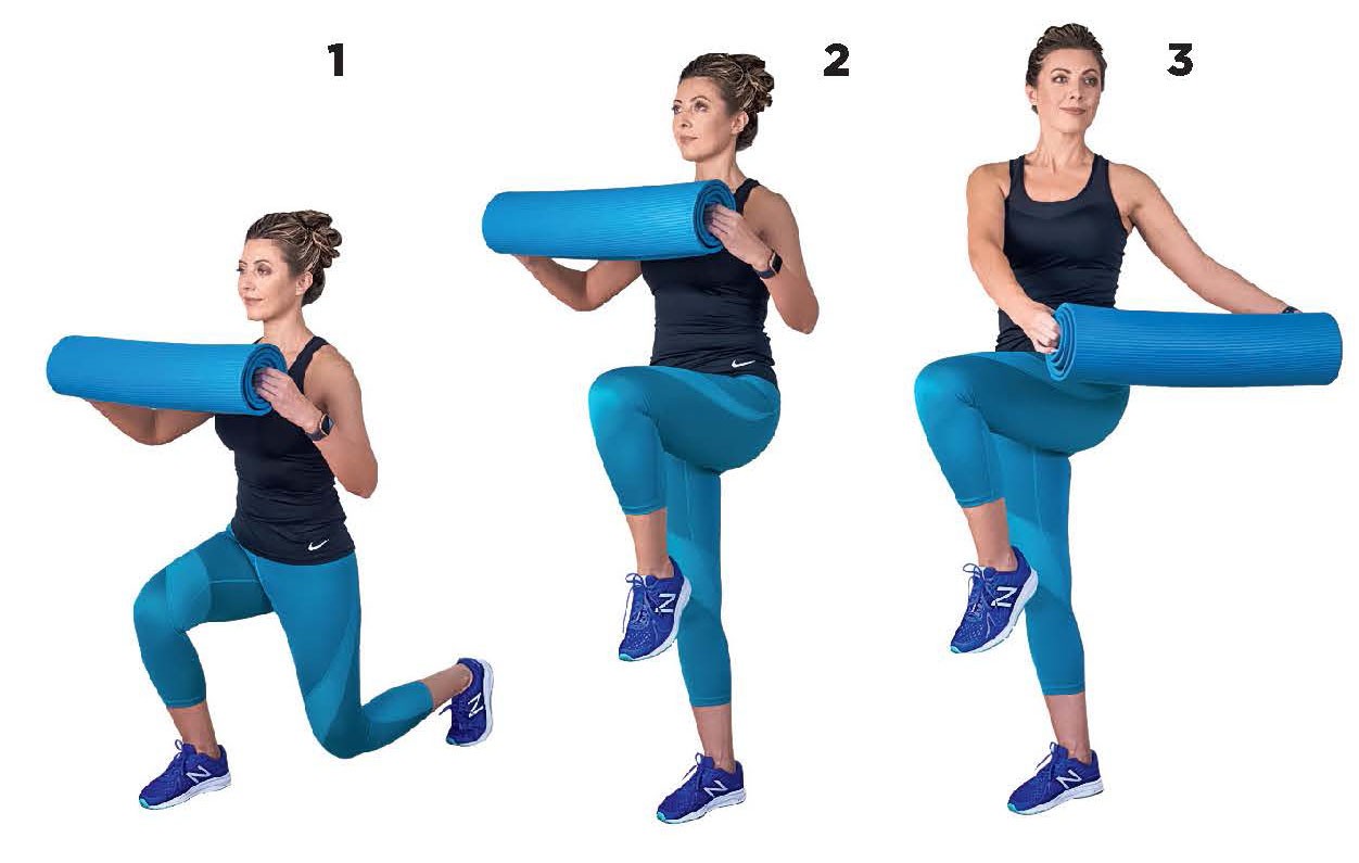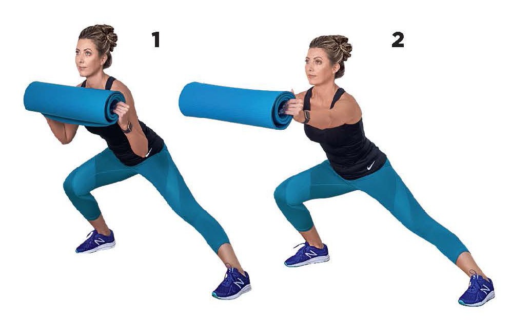 1. Сделайте выпад левой ногой назад, контролируйте мышцы центра.