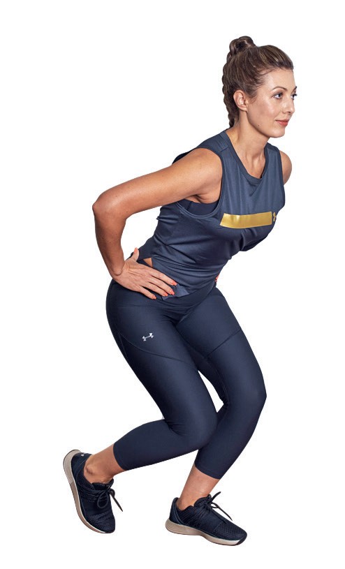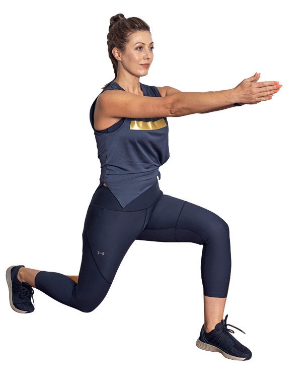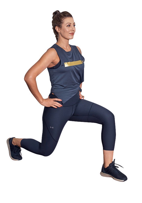 1. Встаньте в позицию выпада, колени – под углом 90 °, руки – на поясе. Держите мышцы центра в тонусе. Расправьте плечи.