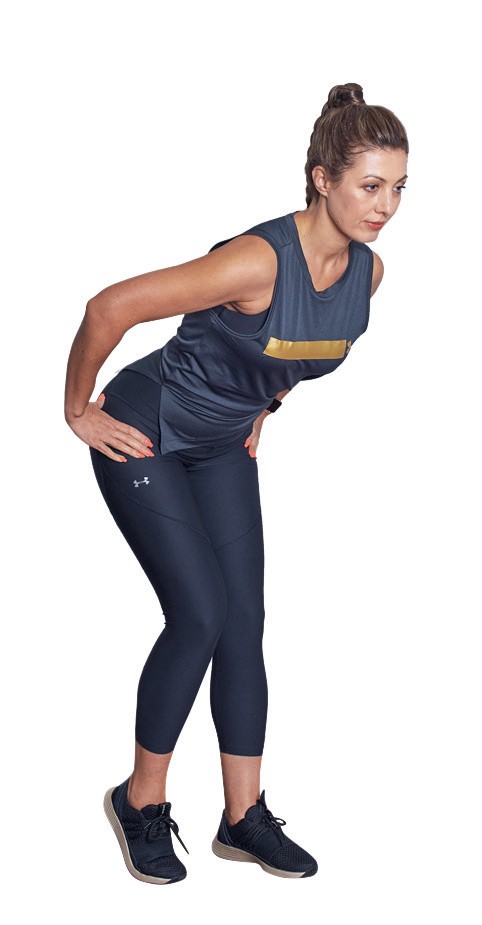 1. Поставьте стопы на ширине таза, правый носок – параллельно левой пятке, руки – на поясе. Выполните наклон корпуса вперед, держите мышцы центра в тонусе, сохраняйте естественный изгиб в пояснице.