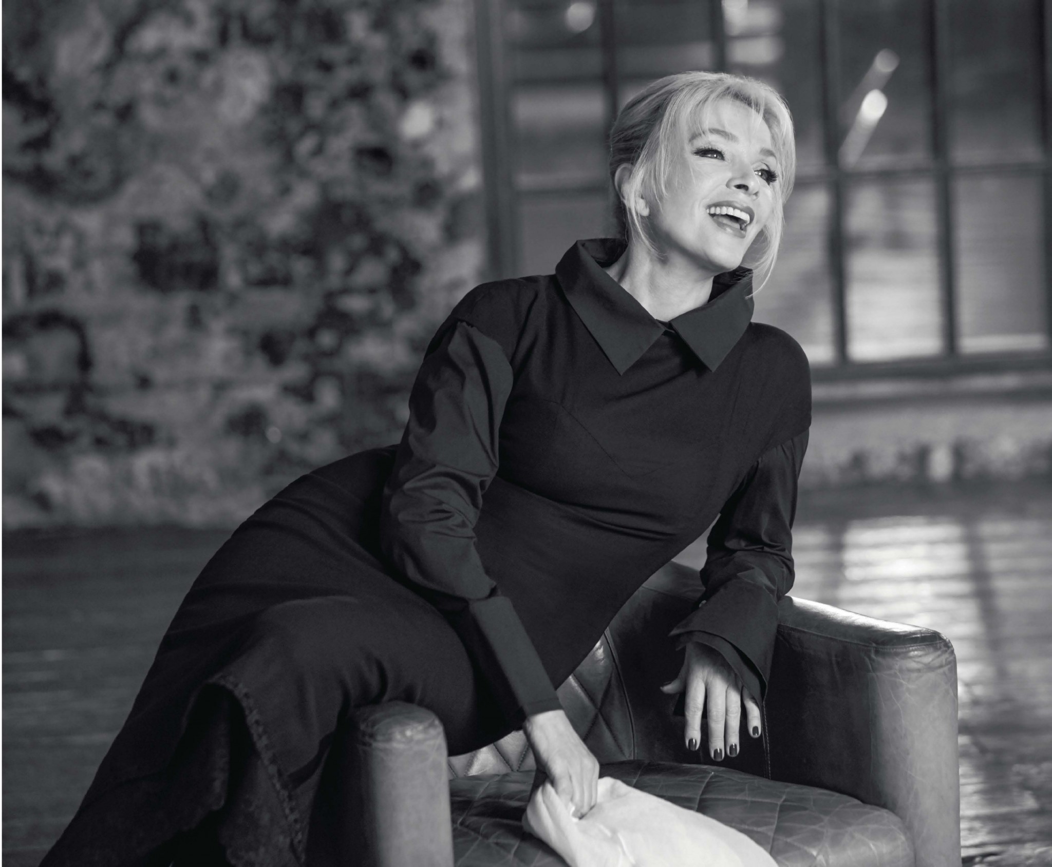 На съемку она приезжает полностью готовая – волосы забраны в высокий хвост, глаза ярко накрашены, вся одежда с собой (ну конечно!). Входит решительным шагом, здоровается с командой – и сразу к гримерному зеркалу, где ждет ее постоянный стилист Сергей Усов