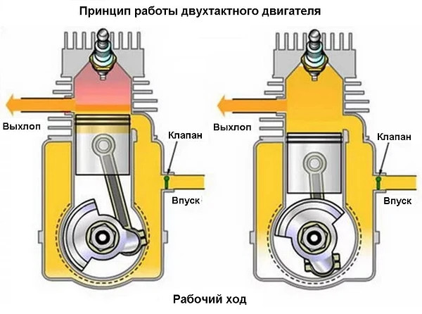 В двухтактных двигателях для завершения одного цикла нужно всего два такта — сжатие и рабочий ход. При этом вместо клапанов здесь используются продувочные и выпускные окна.