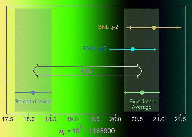 Эксперимент Muon g-2 в Фермилаб, который должен с высокой точностью измерить значение аномального магнитного момента мюона, представил первые результаты. Полученное значение совпало с результатами аналогичного эксперимента E821 в Брукхейвенской национальной лаборатории, а вместе два измерения отличаются от предсказаний Стандартной модели со статистической точностью в 4,2σ. Такое отклонение от теории при дальнейшем уменьшении погрешности измерений может указать на существование еще не открытых частиц или сил в рамках Новой физики. Ученые рассказали о первых результатах на семинаре, а статья с подробным описанием эксперимента опубликована в журнале Physical Review Letters.