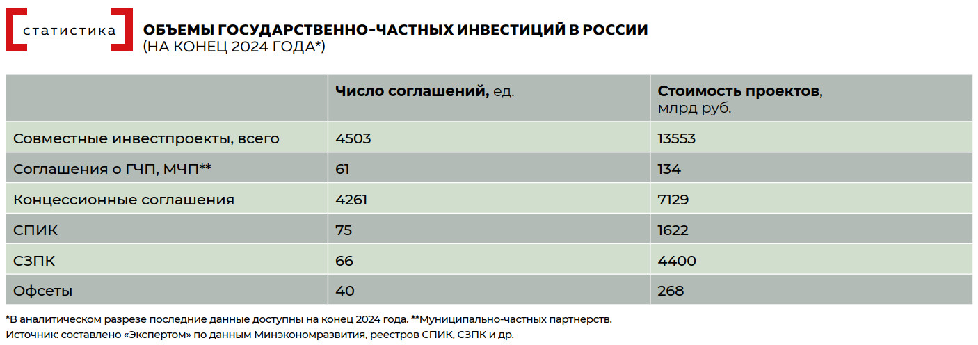 Что общего у парижского Диснейленда, тоннеля под Ла-Маншем и многоразовых ракет Илона Маска? Все эти проекты были реализованы на основе партнерства государства и частных инвесторов. В нашей стране объем капвложений по таким партнерским проектам пока не превышает 4% ВВП, и в основном инструмент применяют при строительстве социальной или транспортной инфраструктуры. После ужесточения денежно-кредитной политики в 2024–2025 годах проектов, способных заинтересовать инвесторов, стало меньше, привлекать кредитные средства — сложнее. Но механизм перезапускается при поддержке института развития ВЭБ.РФ, который де-факто станет «единым окном» для проектов, в которых участвует как частный капитал, так и государственные ресурсы.
