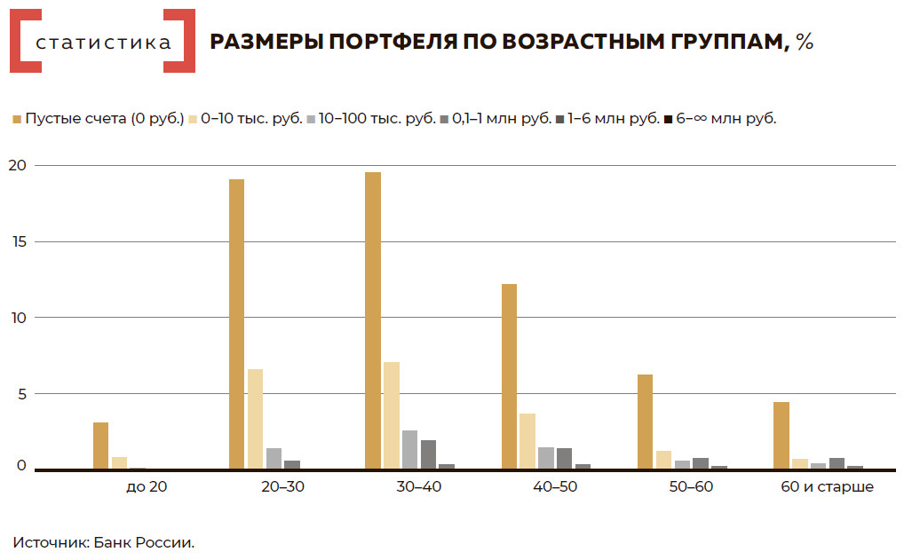 Самая малочисленная группа инвесторов от общего количества счетов — группа до 20 лет с долей ≈4%. Это можно объяснить отсутствием опыта и высокого заработка, без которых пополнение счета и вложение в ценные бумаги становятся затруднительными. К тому же по закону открытие брокерского счета возможно с 18 лет.
