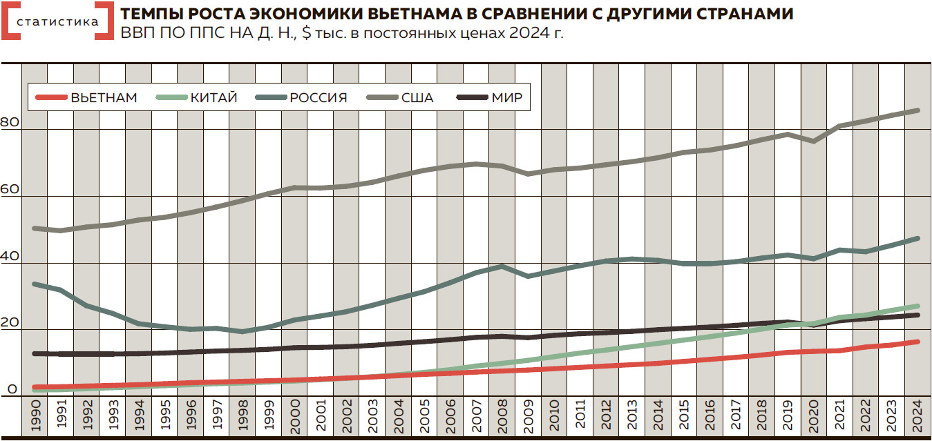 За последние 35 лет Вьетнам прибавлял в среднем по 5,3% в ВВП на душу населения. Это третий лучший результат после Китая и Мьянмы среди сотни крупных стран и в три раза быстрее мировой экономики. В частности, в 2025‑м ВВП Вьетнама прибавил 8% — больше, чем у всех в регионе.