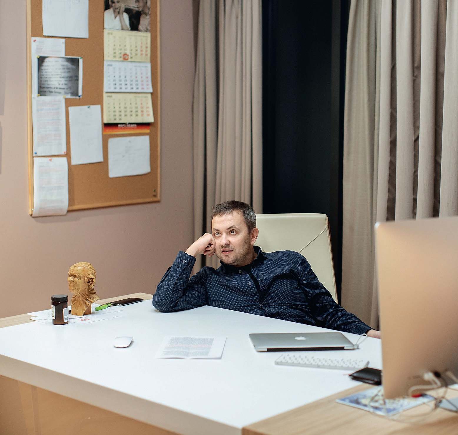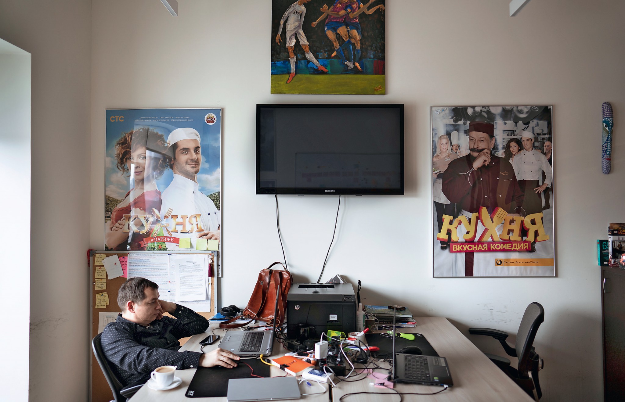 Многие идеи рождаются прямо здесь, в кабинете Шляппо. На стенах развешаны картины белорусских художников (продюсер родом из Витебска). Покупка картин в интернете помогает ему расслабиться.