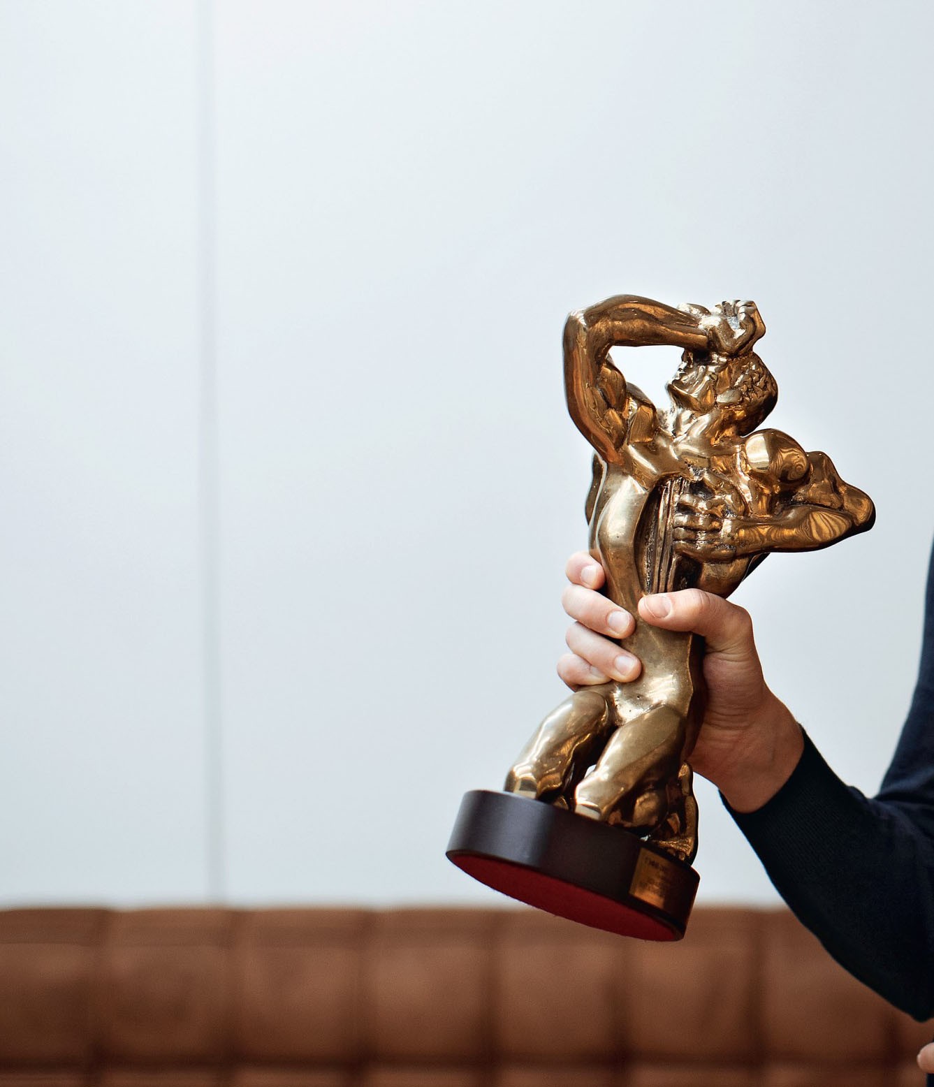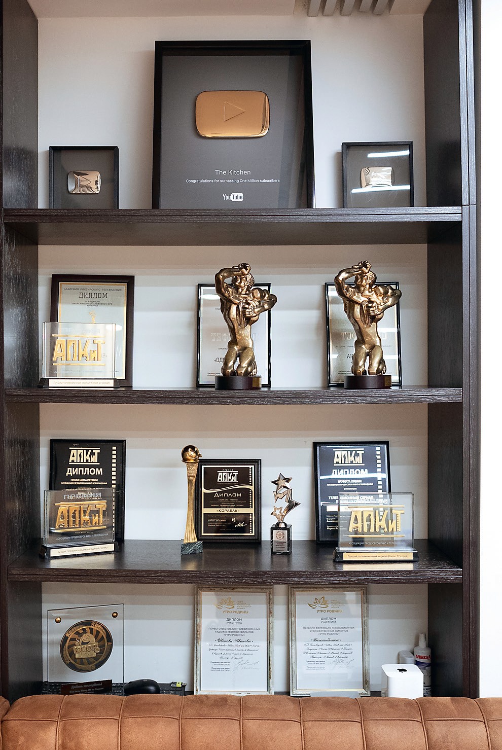 Его трудно вывести на разговор, еще труднее – уговорить покинуть кабинет и дойти до полки с наградами, чтобы сфотографировать со статуэткой «ТЭФИ» (одну из них Шляппо получил в 2009-м за ситком «Папины дочки», другую – в 2011-м за скетчком «Одна за всех»). На этой же полке стоит «Золотая кнопка YouTube», которую площадка вручает каналам, набравшим больше миллиона подписчиков. Это награда каналу сериала «Кухня», который посмотрел в среднем каждый пятый россиянин.