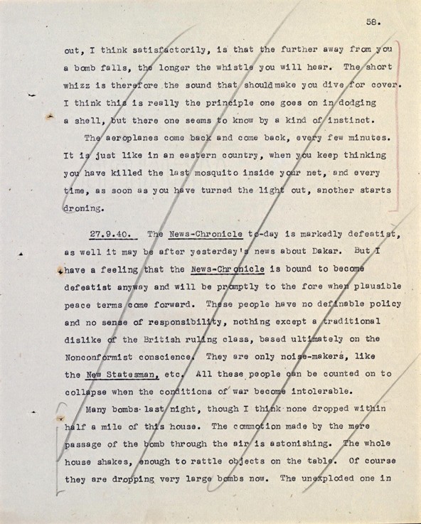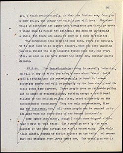 <...> Все разваливается. Нутро выворачивает оттого, что я продолжаю в такое время писать рецензии и т. д., и даже возмущает, что подобные растраты времени все еще допускаются. Собеседование в военном министерстве в субботу может что-то дать, если я ухитрюсь проскочить врача. Стоит попасть в армию, и я знаю, по аналогии с испанской войной, что я перестану переживать из-за общественных событий. Пока что я чувствую себя так, как в 1936-м, когда фашисты надвигались на Мадрид, только намного хуже. <...>