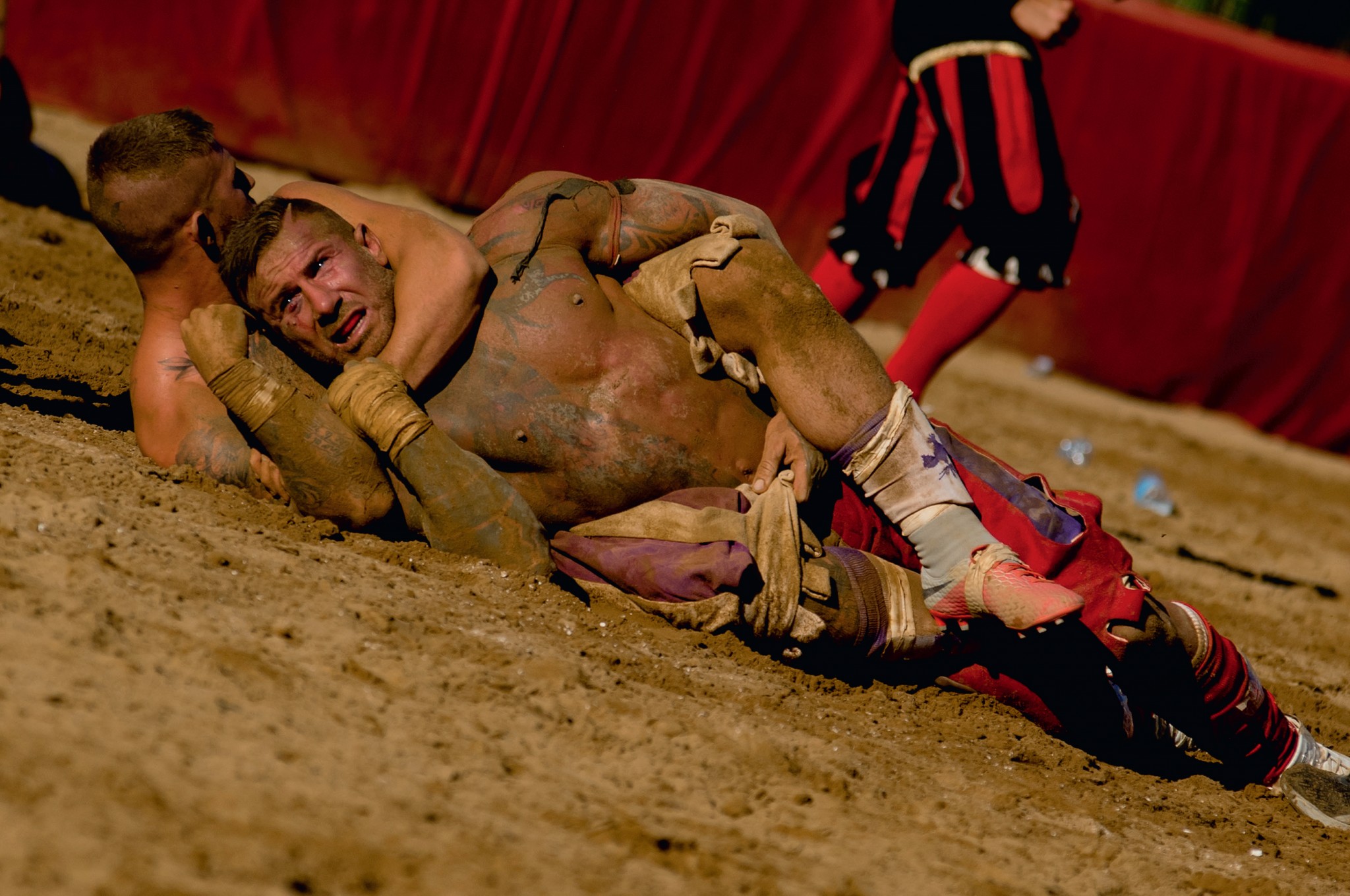 4 цвета , 4 церкви , 4 команды; 360 дней физических и психологических тренировок; 27 игроков-гладиаторов (кальчианти) на арене перед базиликой Санта-Кроче, 40 градусов жары. 50-минутная схватка без единого перерыва, сломанные кости и носы, сотрясения мозга, оскорбления, ликование, кома, смерть, слава. Два полуфинала, заключительная игра 24 июня – святой Иоанн, небесный покровитель Флоренции, молись о нас!