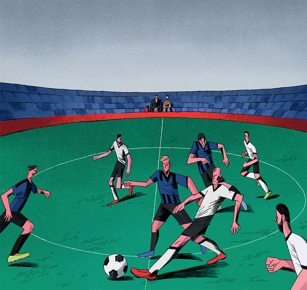 Мяч держится в центре поля, и футболисты, извалявшиеся в грязи и уставшие, ждут перерыва. Зрителей мало, и они напряженно молчат. Футбольное поле полысело в центре, а по флангам совсем не стриженное. Володе это поле напоминает череп начальника, редактора отдела «Общество» Алексея Михайловича: всклокоченные волосы вокруг аккуратной плеши. На несколько минут Володя оказывается во власти сюрреалистичной фантазии: футболисты карабкаются по темени Алексея Михайловича.