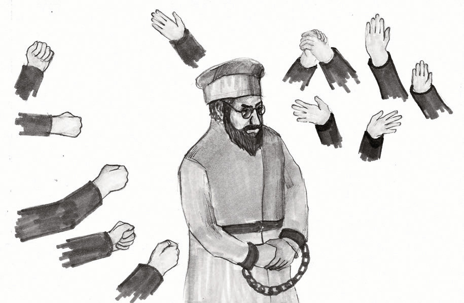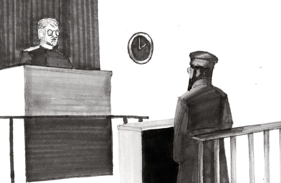 Наконец под конвоем вводят Бейлиса. Лицо смуглое‚ заросшее черной бородкой.