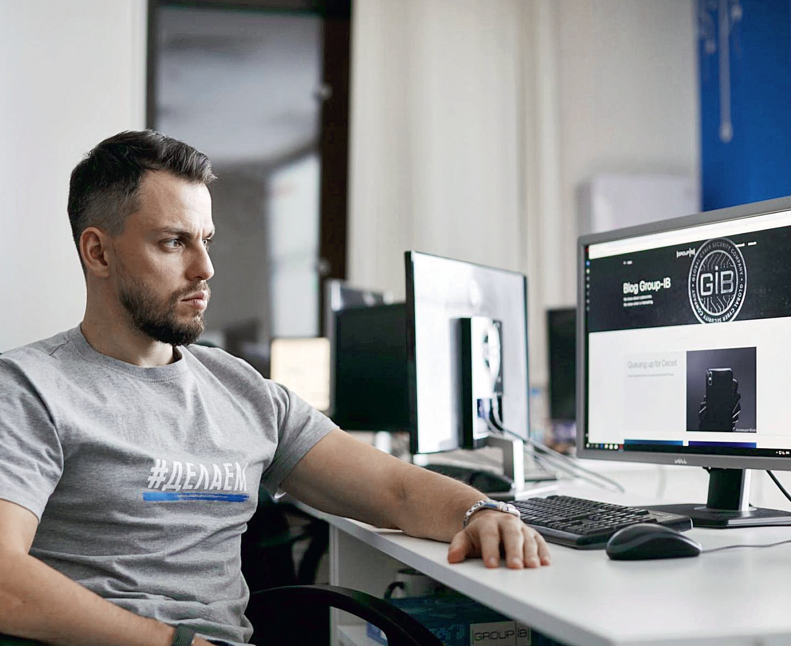 Московский офис Group-IB занимает четыре этажа бизнес-центра в Южнопортовом районе Москвы. На стеклянном столике в холле аккуратно разложены журналы, на обложках – Илья Сачков. Рядом черные папки с логотипом, напоминающим эмблему «Людей в черном». Это для потенциальных клиентов – как правило, владельцев крупного бизнеса, людей из финансового сектора.