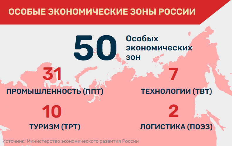 В России особые экономические зоны считаются одним из самых масштабных проектов по привлечению прямых инвестиций в перспективные секторы экономики — обрабатывающие и высокотехнологичные производства, туризм, портовую и транспортную инфраструктуру и другие. Они создаются по решению правительства РФ на 49 лет, в течение которых работающие там российские и зарубежные инвесторы пользуются конкурентными преимуществами для реализации своих проектов: это минимальные административные барьеры, налоговые льготы и таможенные преференции, сниженные цены на аренду и выкуп земли, помощь в запуске и реализации инвестпроекта на первой стадии и сопровождение управляющими компаниями ОЭЗ в дальнейшем.
