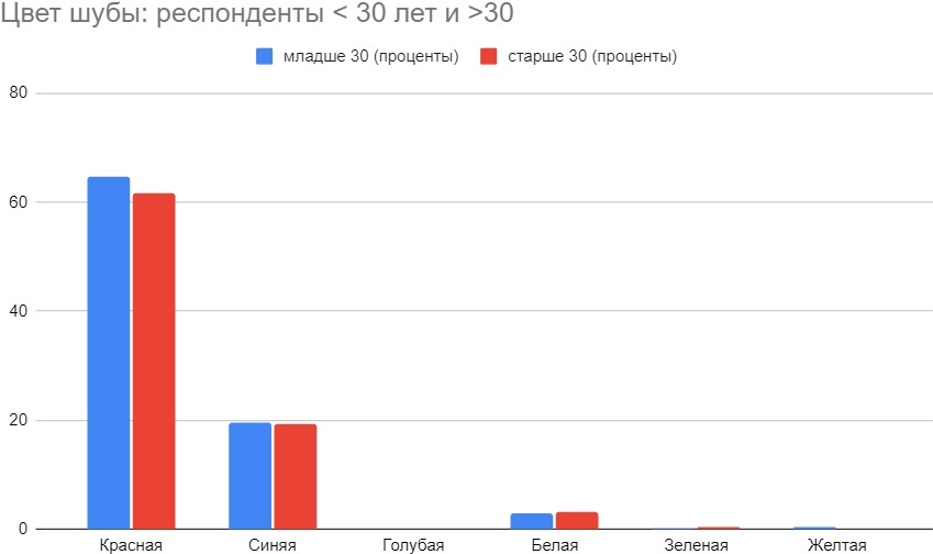 Как видно из ответов, две трети респондентов считают, что шуба должна быть красной. При этом гипотеза, что дело в возрасте, и в советское время правильный Дед Мороз ходил только в синей шубе, не подтверждается. Мы разделили опрошенных на две группы: старше 30 лет (последнее советское поколение, чье детство пришлось на начало 1990-х) и младше. Как видно, обе группы согласны друг с другом относительно цвета шубы: