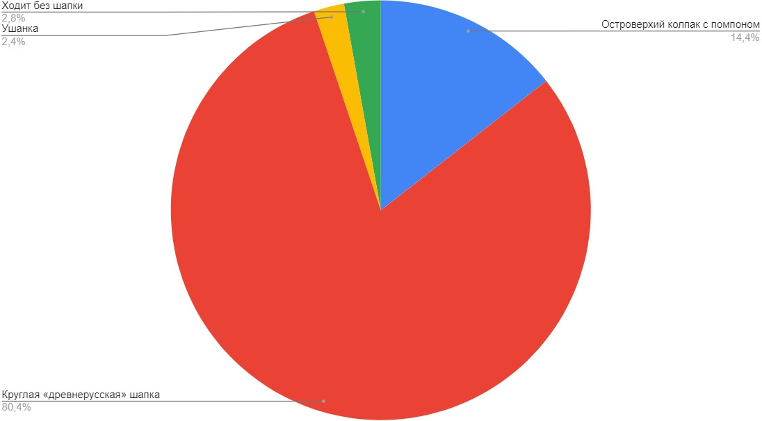 Мы попросили опрошенных выбрать правильную шапку для Деда Мороза из такого набора: островерхий колпак с помпоном, круглая «древнерусская» шапка, ушанка, ходит без шапки, и свой вариант. В этом случае читатели практически единогласно проголосовали за круглую древнерусскую шапку, ее считают одним из главных признаков Деда Мороза больше 80 процентов опрошенных.