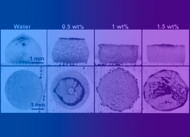 Китайские физики заморозили капли воды и суспензии наночастиц оксида алюминия на супергидрофобной поверхности из нано/микро-структурированного оксида меди. В ходе эксперимента ученые следили за распределением температур и формой капель: капли воды замерзли с острым кончиком на вершине, тогда как наносуспензия замерзла в форме цилиндра. Авторы предполагают, что все дело во втором потоке тепла в капле, который увеличивает горизонтальное расширение на вершине капли. Статья опубликована в журнале Langmuir.