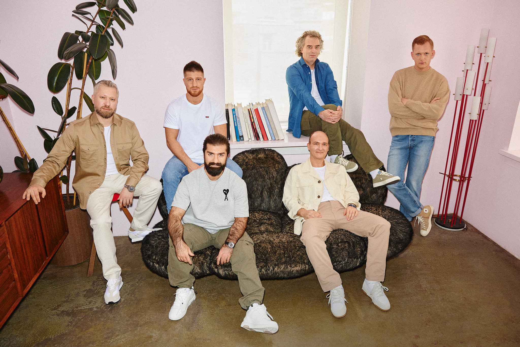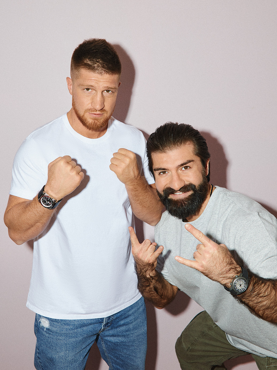 Сулейман (слева): футболка Levi’s, джинсы Acne Studios (ЦУМ), кроссовки Off-White (ЦУМ), часы Bell & Ross BR 03-93 GMT. Артур: футболка Puma x AMI (Peak Store), брюки Ralph Lauren (ЦУМ), кроссовки Off-White (ЦУМ), часы Chopard L.U.C GMT One