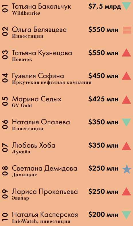 Первое место в рейтинге богатейших self-made-женщин России осталось у основательницы Wildberries Татьяны Бакальчук (№1, $7,5 млрд). Если учитывать объем бизнеса этого интернет-маркетплейса и продолжающийся рост рынка онлайн-торговли, вряд ли кто-то сможет составить конкуренцию Татьяне Бакальчук в ближайшие годы.
