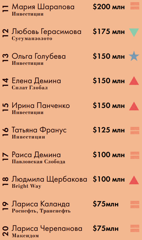 В этом году в рейтинге появились две новые участницы — представительницы семейного бизнеса. Светлана Демидова (№8, $250 млн) вместе с супругом владеет сельскохозяйственной группой «Доминант» (сахарные заводы, молочные фермы и предприятия). Ольга Голубева (№13, $150 млн) вместе с мужем продала Петербургскую топливную компанию «Роснефти». Сейчас под контролем супругов остается Петербургский городской банк, галерея бутиков Grand Palace на Невском проспекте и Петербургская транспортная компания (городские и междугородние автобусные перевозки).