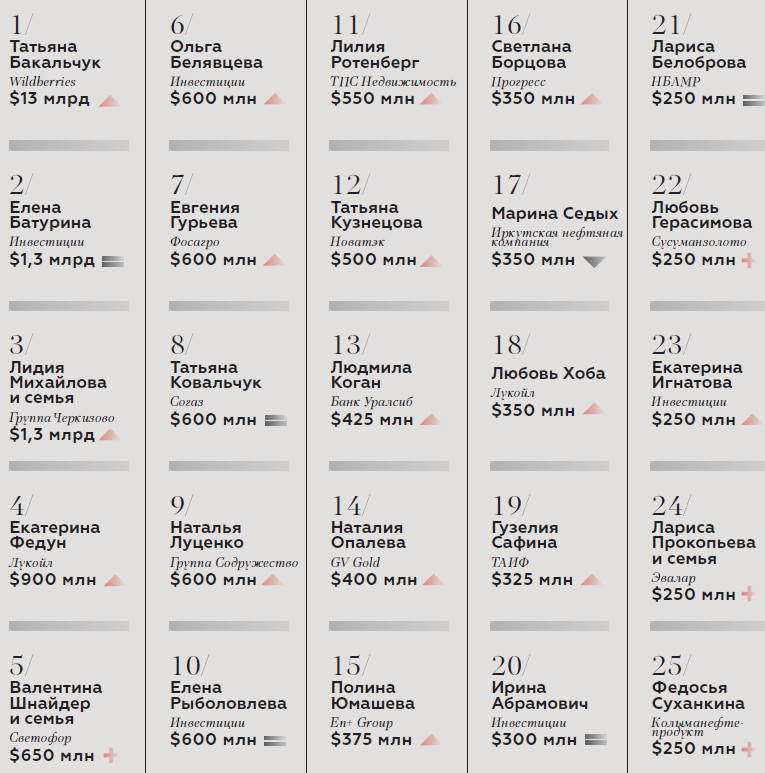 Каждый год Forbes составляет список богатейших женщин России. В этом году в нем четыре новых имени, а совокупное состояние участниц рейтинга достигло $25,3 млрд.