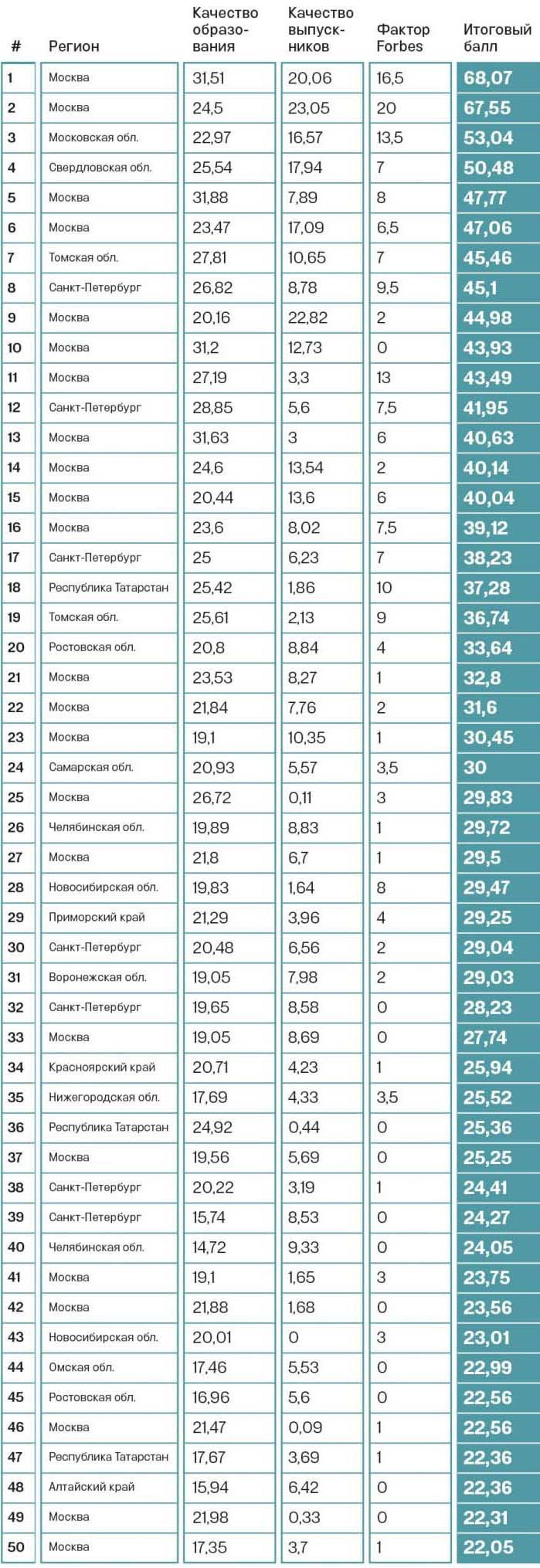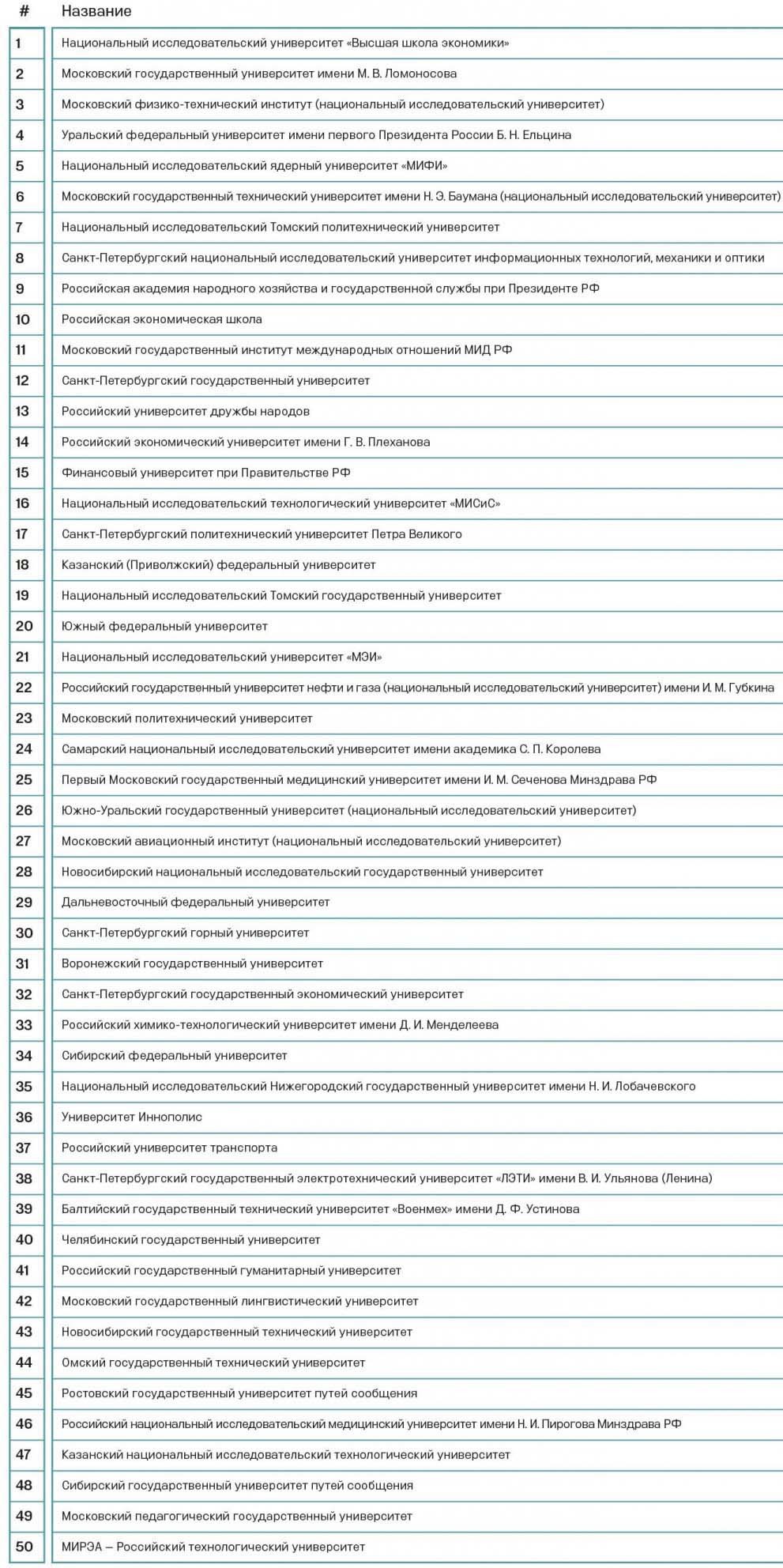 Изменение методики повлекло за собой серьезные перестановки в рейтинге по сравнению с прошлым годом. В этом году рейтинг возглавила Высшая школа экономики. В интервью Forbes ее основатель и бессменный ректор Ярослав Кузьминов (см. стр. 100) рассказал, какие проблемы есть у российских вузов и что ждет наше образование. МГУ взлетел на вторую строчку — во многом благодаря тому, что получил наивысшие баллы от работодателей. Статью о реформе крупнейшего вуза страны читайте на стр. 112. А вот Московский физико-технический институт сохранил место в тройке лидеров, несмотря ни на что. Впервые в рейтинг вузов вошел молодой университет Иннополис из Татарстана — статью о нем читайте в этом выпуске.