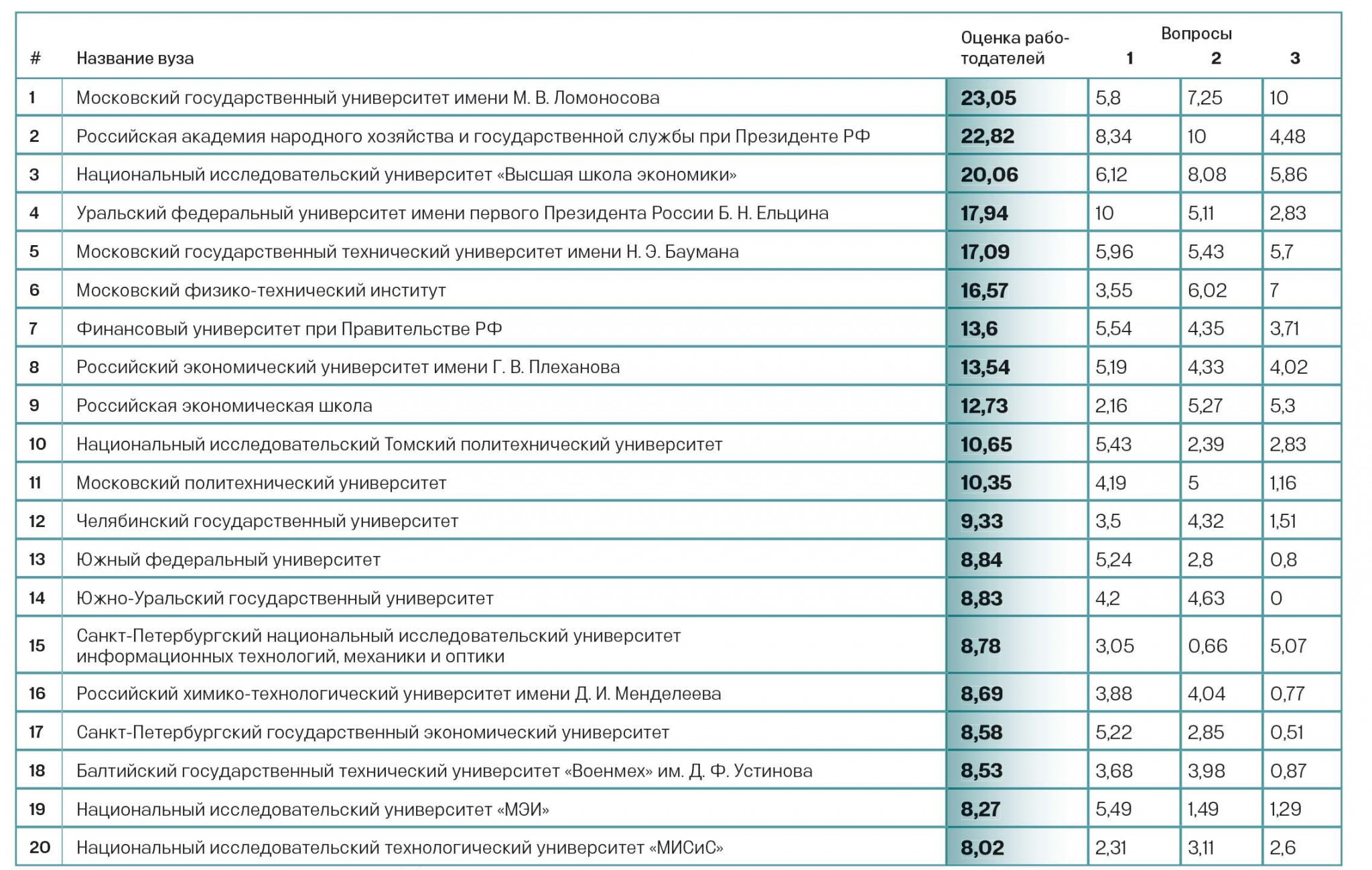 Кроме того, мы решили провести свое исследование и выяснить, выпускников каких вузов больше всего любят работодатели. Именно из их ответов мы сформировали обновленную метрику «Качество выпускников» (30 баллов). Совместно с сервисом «Авито Работа» мы направили запросы в 127 крупнейших компаний и попросили ответить на три вопроса: «Выпускников каких вузов вы наняли в 2019–2020 годах?», «Недавние (до 5 лет) выпускники каких вузов получили повышение зарплаты и/или должности в 2019–2020 годах?», «Выпускников каких вузов вы хотели бы нанимать в приоритетном порядке, кто из них, на ваш взгляд, наиболее подготовлен?». Заполнить анкеты согласились 59 компаний, совокупная численность их сотрудников составляет 4 млн человек. Чем крупнее компания, тем больший вес присваивался ее голосу. Голос компании распределялся между всеми вузами, которые были отмечены в ее анкете: чем меньше вузов, тем выше оценка, относящаяся к тому или иному вузу. Все оценки по каждому вузу суммировались и переводились в балльную систему — вуз мог получить максимум 10 баллов за каждый из трех вопросов. Наконец, мы изменили подход к метрике «Фактор Forbes» (20 баллов), который отражает элитарность учебного заведения. Мы учли присутствие вузов в ведущих зарубежных рейтингах — QS World University Rankings и Times Higher Education (10 баллов), а также «омолодили» состав известных выпускников и студентов (10 баллов): оценки получили те вузы, в которых учатся дети из списка 200 богатейших бизнесменов России и номинанты рейтинга молодых и успешных россиян по версии Forbes «30 до 30».