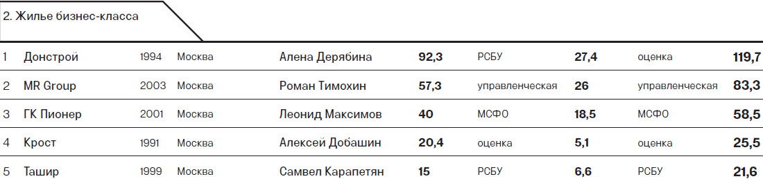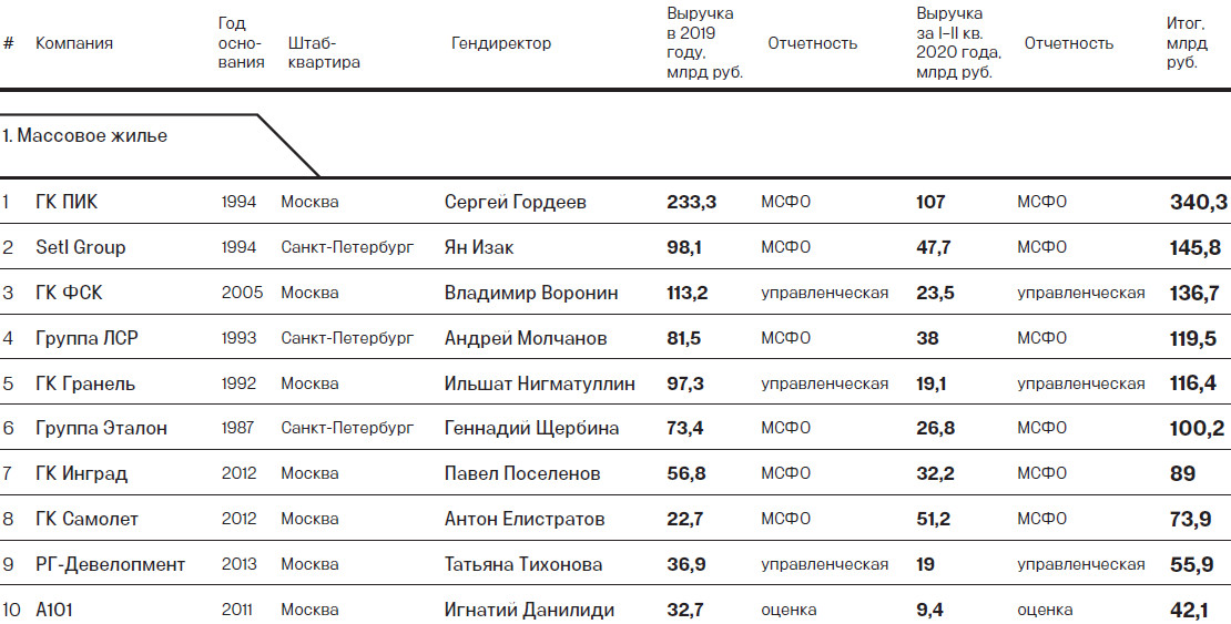 у девелоперов клубных домов. Совокупная годовая выручка топ-10 застройщиков массового жилья приближается к 1 трлн рублей — 845 млрд рублей за 2019 год. По итогам полутора лет с большим отрывом лидирует ПИК Сергея Гордеева, а его вечного конкурента группу ЛСР Андрея Молчанова немного опередили питерская же компания Setl Group Максима Шубарева и ГК ФСК Владимира Воронина. Есть компании, которые специализируются на чем-то одном, как, например, Vesper на элит-ном жилье и объектах класса премиум (эти два сегмента мы объединили в один). Большинство же реализуют проекты в разных сегментах — и в бизнес-классе, и в сфере элитного жилья. Выбирая, кого из застройщиков к какому сегменту отнести, мы смотрели на долю объектов того или иного сегмента в его портфеле. Но выручка каждого застройщика по отдельным сегментам не разбивалась.