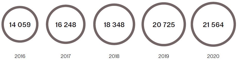 В 2020 году компания открыла 1410 новых магазинов, их общее число на конец года составило 17 707. Магазины ежедневно обслуживали в среднем 12,7 млн покупателей. К июлю 2021 года количество розничных магазинов группы выросло до 18 295. В 2020 году группа получила 28,3 млрд рублей ($391 млн) чистой прибыли. Выручка X5 Retail Group по итогам года выросла на 14,1%, торговые площади — на 8,3% (до 7,8 млн кв. м). Максимальная доля в выручке компании (81%) принадлежит сети «Пятерочка», в которую входит 16 709 магазинов (на конец 2020 года). За ней с 16% следует сеть «Перекресток» (933 супермаркета) и с 3% сеть «Карусель» (56 гипермаркетов). Онлайн-продажи X5 Retail Group в 2020 году выросли на 362,2% (до 20,1 млрд рублей).