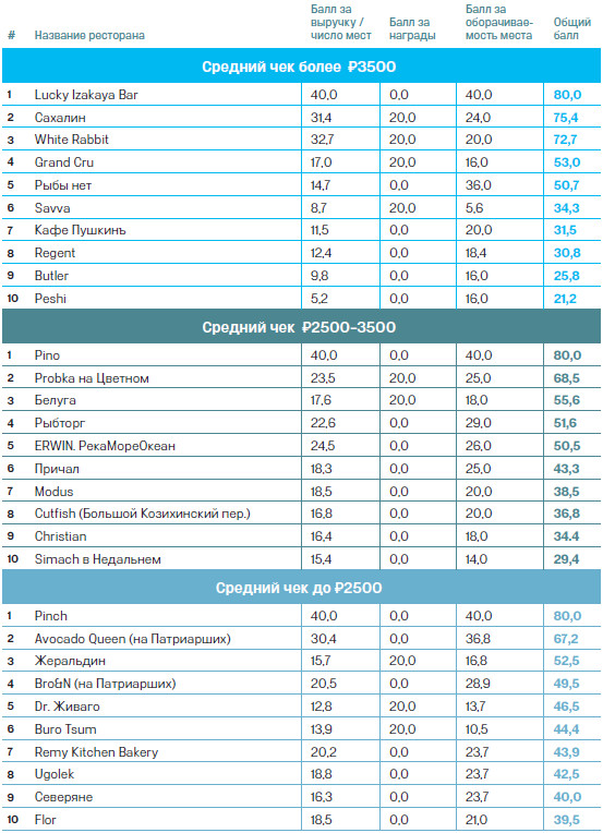 Почти треть заведений, попавших в финальный список, имеют значимые международные награды. Московский ресторанный рынок по-прежнему остается не самым прозрачным, выручку некоторых заведений нам пришлось оценивать самостоятельно, опираясь на данные «СПАРК-Интерфакса», мнения экспертов и средний чек. Многие рестораторы отказывались предоставлять свои данные. В категории со средним чеком менее 2500 рублей на первом месте снова оказался ресторан Ильи Тютенкова Pinch, а вот в категории со средним чеком от 2500 до 3500 рублей новый лидер — Pino Александра Оганезова, открывшийся накануне пандемии. Список заведений со средним чеком более 3500 рублей в этом году возглавляет Lucky Izakaya Bar — флагманское заведение успешной Lucky Group. Несмотря на ограничения, связанные с пандемией COVID-19, удачные концепции продолжают приносить рестораторам славу и деньги.