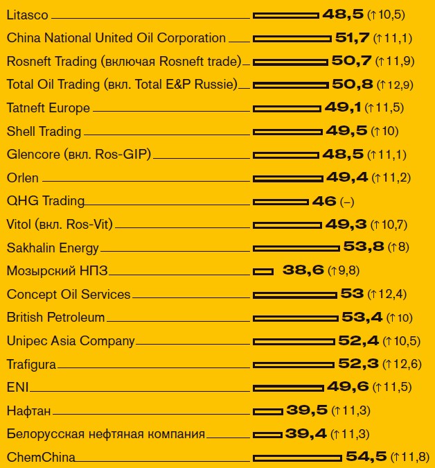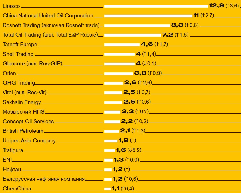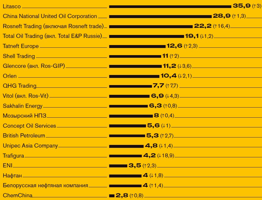 Как и в двух предыдущих рейтингах, первое место по стоимости закупленного сырья занял Litasco, швейцарский трейдер «Лукойла». В 2017 году он приобрел 35,9 млн т российской нефти почти на $13 млрд. Основной объем пришелся на нефть материнской компании. Но «Лукойл» выставил на продажу свое трейдерское подразделение, и если компанию купит кто-то из глобальных трейдеров — а это один из реальных вариантов, то в следующем году лидер нашего рейтинга может поменяться. Сохранить второе место удалось китайской компании Chinaoil — торговому подразделению CNPC — за счет долгосрочных контрактов с «Роснефтью»: в 2017-м трейдер приобрел 28,9 млн т нефти на $11 млрд. А вот замыкает тройку в этом году трейдерская «дочка» «Роснефти» Rosneft Trading, существенно нарастившая закупки нефти материнской компании. Прошлогодний бронзовый призер — трейдер Trafigura — переместился во вторую десятку рейтинга.