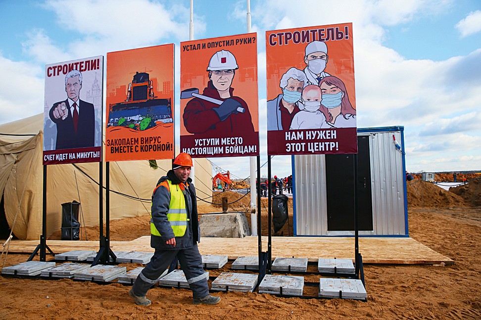 «Закопаем вирус вместе с короной» — такие мотивирующие плакаты висят, если верить официальному сайту Стройкомплекса Москвы, на стройплощадке новой инфекционной больницы в деревне Голохвастово ТиНАО. «Коронавирусный центр», как его называют, площадью 81 000 кв.м начал строиться в чистом поле в марте и на момент подготовки этого номера журнала был готов на 40%. Сергей Собянин поручил строителям уложиться в месяц. По данным сайта Стройкомплекса Москвы, на площадке круглосуточно работают 5000 человек и 1200 машин. Комплекс на 500 коек будет состоять из 50 одноэтажных строений и нескольких секций общежития для персонала, реанимационного и операционного блоков и др. Чтобы управлять движением транспорта, пригласили 50 регулировщиков.
