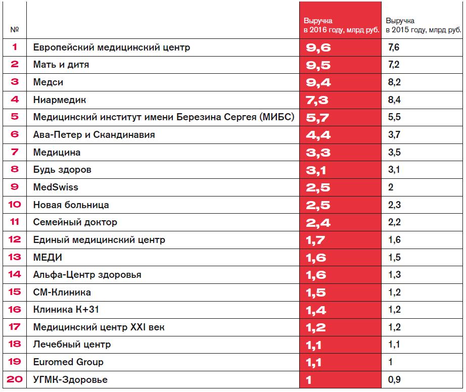 Миллиардеры из списка Forbes собираются делать бизнес на медицине с начала 1990-х, но до сих пор из крупных реализованных проектов можно назвать лишь сеть частных клиник «Медси» Владимира Евтушенкова. В последние два года сообщения о планируемых инвестициях миллиардеров в медицину поступают одно за другим, а владельцы частных клиник с удовлетворением отмечают, что в стране растет только агропром и медицина. По данным «Финам», объем коммерческих медицинских услуг в России в 2016 году вырос на 8%, до 400 млрд рублей. Выросла выручка и у большинства участников первого рейтинга крупнейших частных клиник России по версии Forbes. Самый большой рост показал «Европейский медицинский центр», эта компания заняла 1-е место в рейтинге с годовой выручкой 9,6 млрд рублей, совсем немного отстали серебряный призер «Мать и дитя» — 9,5 млрд рублей и бронзовый «Медси» — 9,4 млрд рублей. По размеру выручки в рейтинг должны были попасть сети диагностических лабораторий «Инвитро» (12,7 млрд рублей), «Хеликс» (3,4 млрд рублей) и «Гемотест» (3,2 млрд рублей), но мы не включили их из-за узкой специализации.