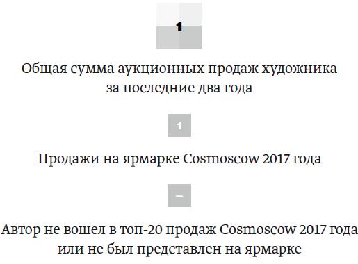 Впервые ярмарка современного искусства Cosmoscow раскрыла цифры продаж: из 54 галерей 70% приняли участие в аналитическом исследовании InArt. Суммарный объем продаж оценен приблизительно в €1,16 млн. Медианное значение по объему продаж составило €12 000. «Цены на работы многих современных российских художников, обладающих широкой известностью, ниже общемировых, — говорит директор-основатель ярмарки Маргарита Пушкина. — Объем продаж Cosmoscow отражает готовность отечественных коллекционеров изменить эту ситуацию. Важно, чтобы коллекционеры понимали, что покупка — это поддержка конкретного художника и вклад в продвижение современной культуры». Рейтинг российских художников составлен на основе продаж Cosmoscow-2017 и аукционых продаж за последние два года.