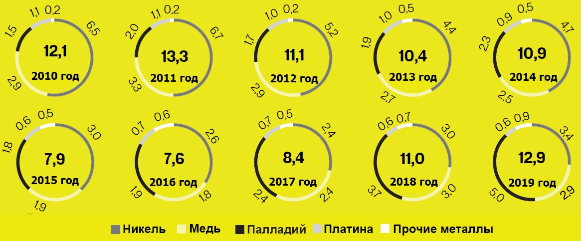 Выручка «Норникеля» от реализации металлов, $ млрд