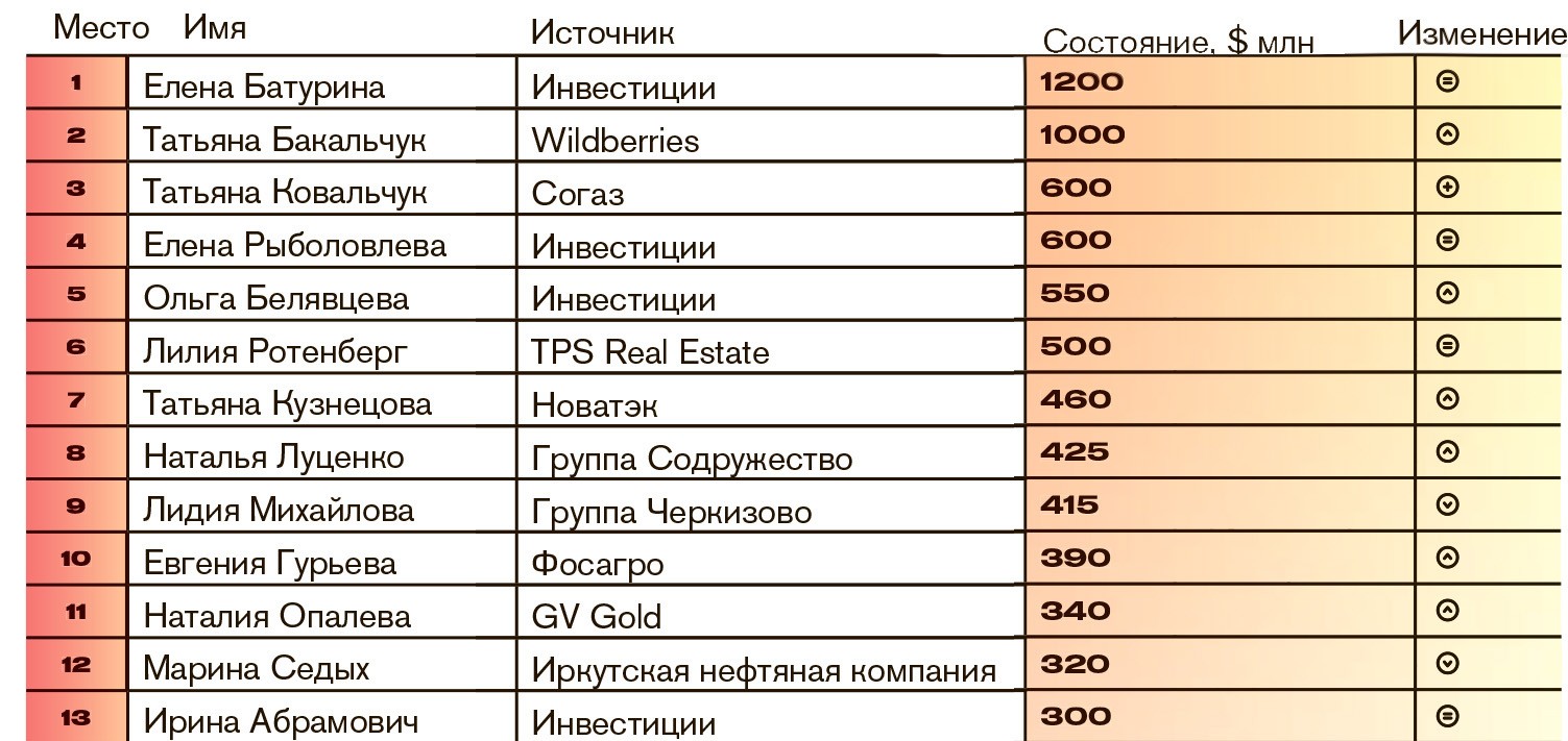 В предыдущие два года состав участниц рейтинга обновился почти наполовину. В этом году больших изменений нет — новичок всего один. Это Татьяна Ковальчук (№3 в рейтинге, оценка капитала — $600 млн), супруга петербургского миллиардера Юрия Ковальчука, который входит в ближайшее окружение президента Владимира Путина. Семье Ковальчуков принадлежит 49,9% компании «Большой дом 9», которая опосредованно контролирует около трети акций крупнейшего российского страховщика — группы «Согаз». Для сделки по покупке страховой компании ВТБ «Согаз» был оценен почти в 600 млрд рублей.