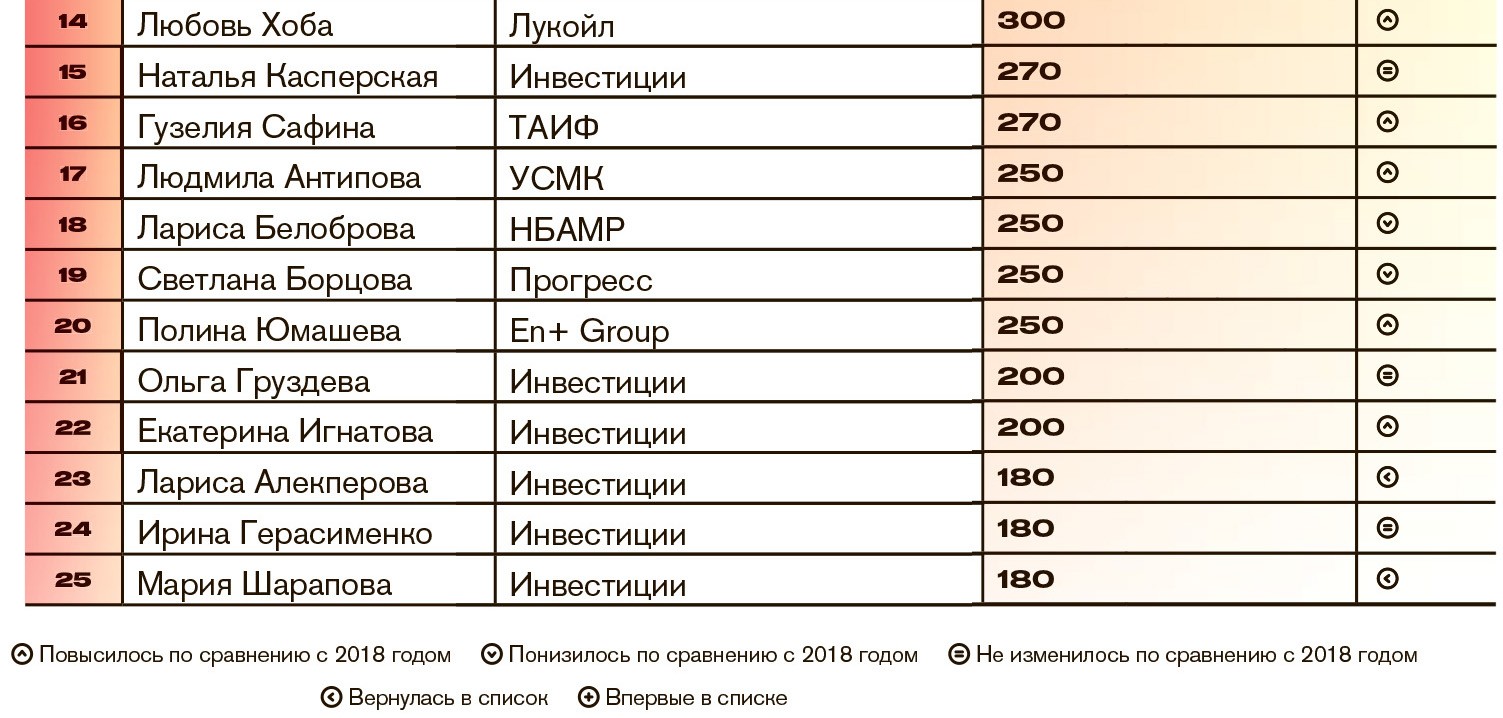 Также в рейтинг вернулись две участницы топ-25 богатейших женщин предыдущих лет. Первая — Лариса Алекперова (№23, состояние — $180 млн), жена акционера и президента «Лукойла» Вагита Алекперова. Ей принадлежит небольшой пакет акций, но за год стоимость нефтяной компании выросла, в том числе благодаря выкупу собственных акций. Вторая — Мария Шарапова (№25, состояние — $180 млн). Отбыв 15-месячную дисквалификацию за применение допинга, теннисистка вернулась на корт, но больших побед пока не добилась. Тем не менее ей удалось, по оценке Forbes, вернуть часть рекламных доходов. Продолжает развиваться и бизнес Шараповой по производству шоколада и конфет под брендом Sugarpova. Ее новым партнером стала компания Hudson Group, управляющая 1000 точек продаж в аэропортах и на железнодорожных вокзалах в США и Канаде.