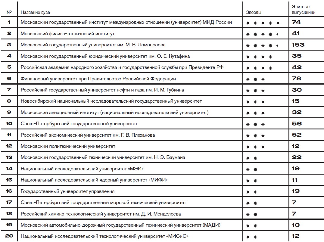 Перед вами 20 вузов, подготовивших наибольшее количество представителей российской политической и экономической элиты (относительно общего числа выпускников). Вузам присвоены условные баллы в виде звезд. Наивысший балл, пять звезд, получил только МГИМО, немного отстали (четыре с половиной звезды) ФТИ и МГУ.