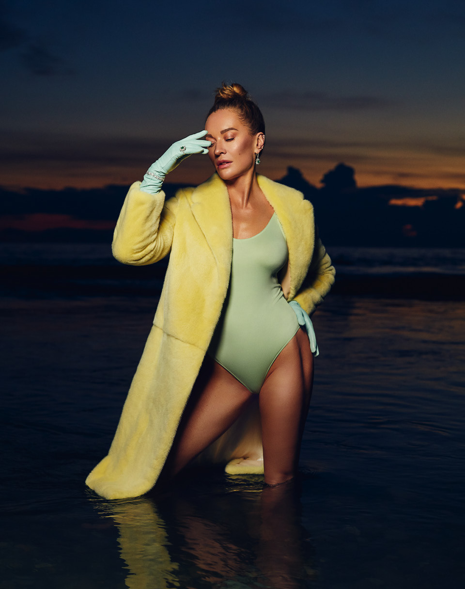 Боди, Levi’s; перчатки, Viva Vox; шуба, Yves Salomon; серьги и кольцо Color, белое золото, изумруды, бриллианты; браслет Classic, белое золото, бриллианты, все Mercury