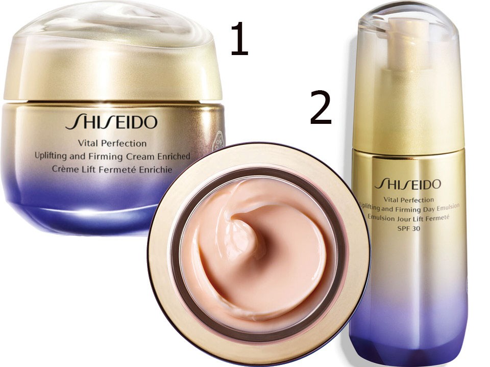 1. Лифтинг-крем, повышающий упругость кожи, 8900 руб., 2. Дневная лифтинг-эмульсия, SPF 30+, 8900 руб. Все Vital Perfection, Shiseido.
